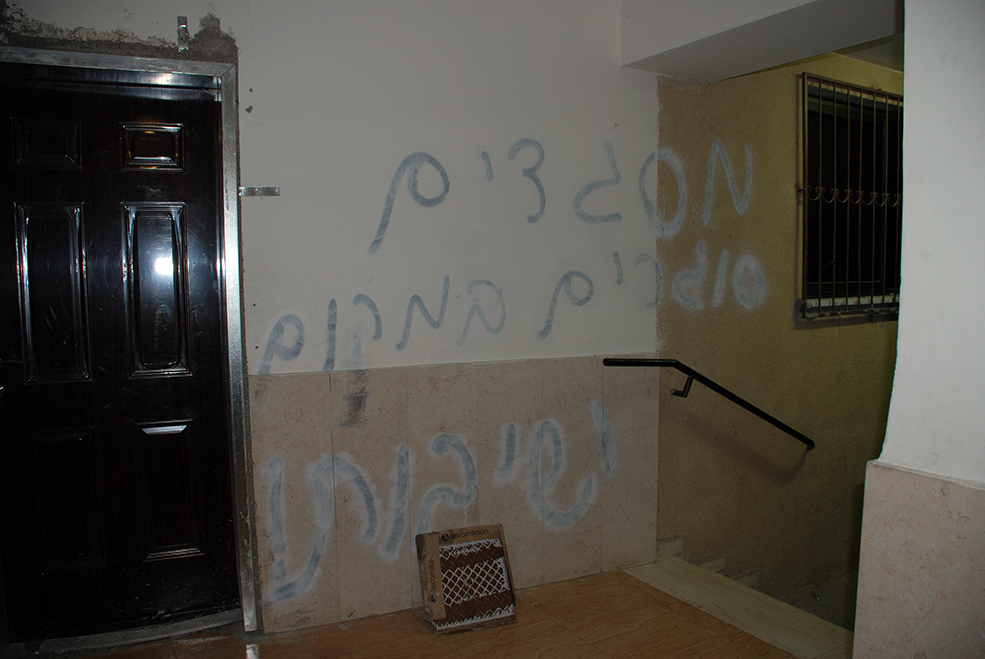 בליל חמישי שעבר, במסגד "אלרחמה" בפרדיס, סימני הכתובות עדיין מרוחות על הקירות, ולצדן ציורים של מגני דוד בצבע כחול, שמישהו ניסה לטשטש עם צבע בהיר יותר. "זה לא הזמן למחוק את זה", אומר האימאם, שייח תאופיק אמין, "בואי נשאיר את הסימנים, כדי שיראו את המעשים שנעשו".
