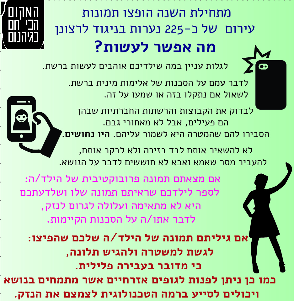 מתחילת 2015 הופצו תמונות אינטימיות של 200 בנות לפחות בישראל מבלי רצונן, כך עולה מנתוני המרכז לאינטרנט בטוח של איגוד האינטרנט הישראלי. בכ-50 אחוזים מהמקרים הנפגעת עצמה התקשרה לקו חם של המרכז שפועל ללא הפסקה1. בשאר המקרים התקשרו הורים או חברים מודאגים.