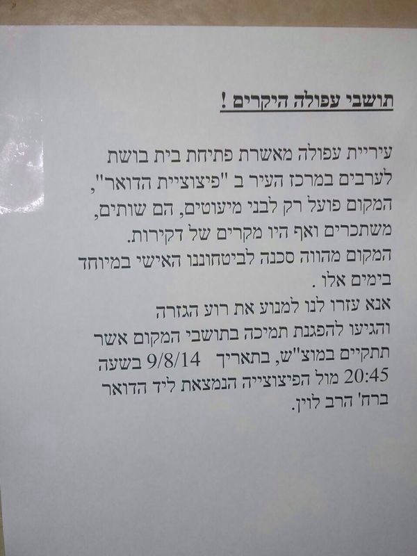 בדיוק 48 שעות חלפו מאז ניסיון ההפגנה הלא מוצלח כנגד פיצוציית הדואר בעפולה. "בית בושת לערבים", היא כונתה בכרוזים שהופצו טרם ההפגנה, ועוד נכתב בהם: "המקום פועל רק לבני מיעוטים, הם שותים משתכרים ואף היו מקרים של דקירות. המקום מהווה סכנה לביטחוננו האישי במיוחד בימים אלו".