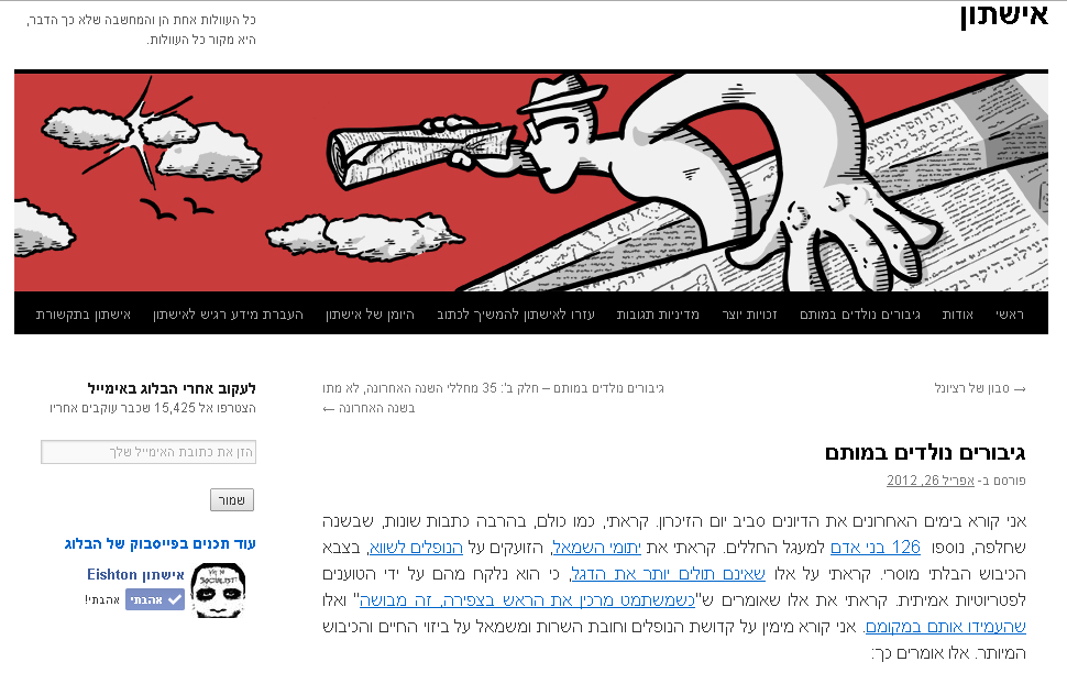 "יש יותר בעבודה הזו מאשר השעות ברחוב, או מול המסך והטלפון. קרה לי משהו שאולי יותר מוכר לכם העיתונאים, כשבעקבות הפוסט של יום הזיכרון שלח לי חייל צה"ל חומר שנע בין סודי לבין בעייתי. מאותו רגע, אולי בגלל כמה שאני "ירוק" בתחום, העברתי כמה שבועות בחרדה. אני מחזיק ביד מסמכים עם שמות וסיבות המוות של חללי צה"ל של השנה האחרונה וכחלק מהתחקיר חשפתי בפני דובר צה"ל ומשרד הביטחון שיש בידי את המידע הזה, הסותר את עמדותיהם הרשמיות. הייתי בטוח שאני אקבל דפיקה בדלת. עיתונאים נעצרים בזמן האחרון על עבירות טכניות, גם כשקיבלו את אישור הצנזורה וגם כשיש מאחוריהם את הגב של העיתון. אז בלוגר קטן שאיש לא מכיר בכלל? וזה לא נגמר שם".
