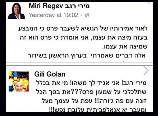 "מירי רגב! אני אגיד לך משהו! מי את בכלל שתלכלכי על שמעון פרס??? את בסך הכל זונה עם פה ג'ורה!!! עפת על עצמך מעל ומעבר יא אנאלפביתית עלובת נפש!!! שקופצת מאולפן לאולפן. אני בז לך! רפש אנושי עלוב!"