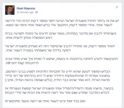 חיון עדכן בזמן אמת בעמוד הפייסבוק שלו על הפרשה. "יש את זה ביותר חולני? משטרת ישראל הגיעה לפני מספר דקות לבית הוריי ודרשה לעצור אותי", כתב חיון. "אחרי מספר דקות התקשר אליי בלש ושאל אותי איפה אני נמצא. כשניסיתי להבין אם מדובר במתיחה, נאמר שהם יודעים על כוונתי לפגיעה בבית ראש הממשלה ולניסיון להצית אותו. לאחר מספר דקות אני מתחיל להבין שהסיפור הזה לא מצחיק ומשטרת ישראל דפקה בדלת של משפחתי במטרה לעצור אותי".