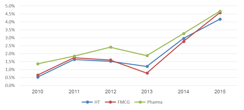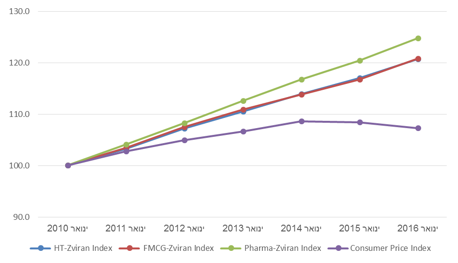 בחברת "צבירן" אנו מתמחים בסקרי שכר בענפי תעשייה שונים. הביטו בגרף שלנו המציג שינויים בשכר בשלושה ענפים – היי-טק, פארמה ותעשיית מוצרי צריכה – בהשוואה לאינפלציה בישראל. אפשר ללמוד מהגרף שני דברים שאולי יפתיעו חלק מכם. הראשון: עליית השכר בענף מוצרי הצריכה לא הייתה נמוכה יותר מעליית השכר בהיי-טק, ואף גבוהה יותר בשנת 2015. השני: השכר של העובדים בענפים הללו עלה באופן ריאלי מאז 2014.