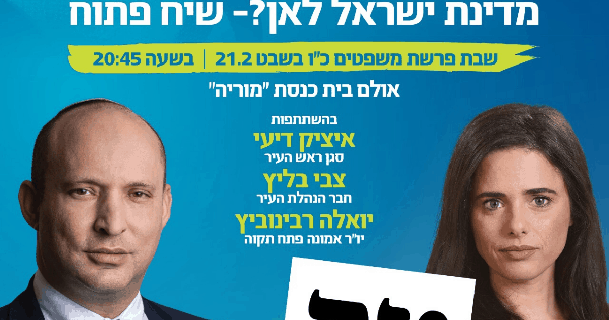 ביום שבת הקרוב, פרשת "משפטים", אמור להתקיים במקום "עונג שבת מרכזי" עם שר הביטחון נפתלי בנט ושרת המשפטים לשעבר איילת שקד. בכרזה שעוצבה לכבוד האירוע נכתב כי יתנהל בבית הכנסת שיח פתוח בנושא "מדינת ישראל לאן?" באותה כרזה התנוססה הלוגו של המפלגה של השניים, "ימינה", וגם האותיות שמלוות את הסיעה ביום הבוחר.