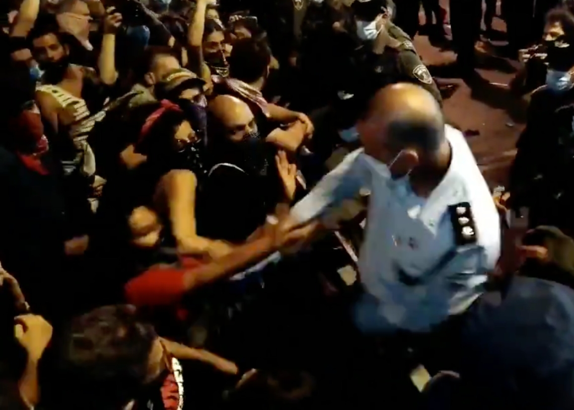 "בנוגע לשוטרת שתועדה מכה מפגינה: מבירור ראשוני שנערך עולה כי במהלך פיזור הפרת הסדר, המפגינים ובהם המפגינה נהדפו לעבר המדרכה, ובתגובה סטרה האישה בפני השוטרת ולכן היא נעצרה לחקירה. נציין כי האלימות הקשה והפסולה שהופנתה אמש נגד השוטרים הובילה לפציעתם של 5 שוטרים, לאחד מהם נשברה צלע מבעיטה, שוטר אחר קיבל מוט ברזל ברגלו ושוטר נוסף אגרוף בראשו. במהלך המחאה המשטרה עיכבה/עצרה 30 מפרי סדר בחשד לעבירות הפרת סדר ותקיפת שוטר. נמשיך לאפשר את חופש המחאה בגבולות החוק, אולם לא נאפשר התפרעויות אלימות, הפרת הסדר הציבורי ואלימות כלפי שוטרים בניגוד לחוק.