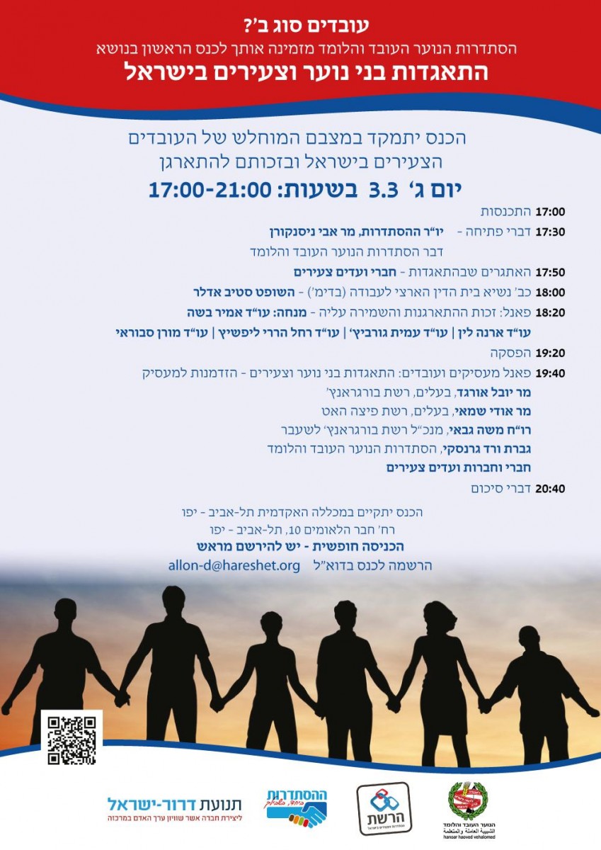 נקודה בעייתית אף יותר היא כי בפרסומים מופיעים כל משתתפי הכנס, כראוי, בשמם המלא לצד תואריהם (שופט, עו"ד, מר, גברת) ותפקידיהם (יו"ר ההסתדרות, הבעלים של רשת בורגראנץ' וכד'), למעט בני ובנות הנוער. אלו לא הוצגו בתואר, או אפילו בשמם. הם פשוט נדחסו לשורה לקונית המציגה אותם כמקשה אחת – "חברי ועדים צעירים". אין לי ספק שכוונותיהם של מארגני הכנס טובות, אבל האופן שבו אורגן האירוע עוזר לשמר את הסדר הקיים הגילני1.