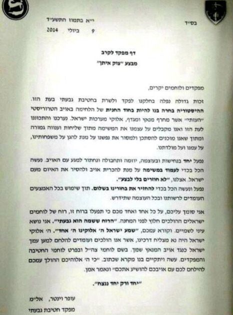 במכתבו בחר מח"ט גבעתי לצטט פסוקי מקרא, כולם מהותיים ומשמעותיים. אתייחס לשלושה מהם: הפסוק הראשון, והמוכר שבהם, "שמע ישראל אדוני אלוהינו אדוני אחד" (דברים, ו, ד) שהפך לאורך ההיסטוריה לקריאתו של המרטיר היהודי אשר עומד מול מותו. הראשון להשתמש בפסוק זה על סף מוות היה רבי עקיבא – שהוצא להורג על חלקו במרד בר כוכבא. התלמוד הבבלי מתאר כיצד הרומאים מרטשים את גופו של רבי עקיבא באמצעות מסרק ברזל ענק, ואילו רבי עקיבא קורא באותו זמן את הפסוק המדובר ונשמתו יוצאת כאשר הוא מגיע אל המלה "אחד" – בעקבות סיפור זה יהודים רבים קראו "קריאת שמע" בזמן שעמדו מול מותם. במכתבו מבקש מח"ט גבעתי להעניק לפסוק משמעות חדשה – לא עוד קריאתו של היהודי שפושט את צווארו וממתין למותו – אלא קריאתו של הלוחם שיוצא למלחמה.