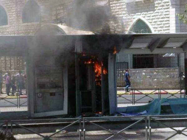 תחנת הרכבת הקלה עולה בלהבות. צילום: חוסם עבד