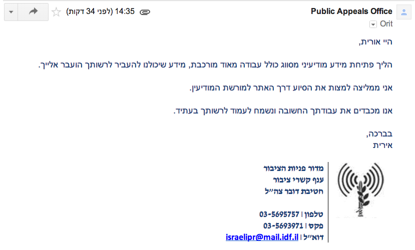 נחושה ואופטימית פניתי למדור פניות הציבור בדובר צה״ל. הצגתי את עצמי כסטודנטית לתואר שני במשפטים בבית הספר לכלכלה בלונדון, פירטתי את נושא המחקר שלי ואת המקרה המתואר וביקשתי את תגובתו של דובר צה״ל לארבע שאלות רלוונטיות שניסחתי בקפידה. לא קיבלתי תשובה. בהיעדר תגובה, התקשרתי למדור הרלוונטי והסברתי בנימוס את חשיבות העניין. התבקשתי לשלוח שנית את הפנייה המנוסחת בכתב, באי-מייל. הפנייה נשלחה שנית וכעבור כמה ימים וכמה טלפונים נוספים, נעניתי בבקשה שאמלא ״טופס פניית חוקרים״. השקעתי כמה שעות למילוי הטופס המפורט עם פרטי הצעת המחקר שלי, כולל חלק שבו התבקשתי לציין ״השלכות ויישומים אפשריים לצה"ל״. ליתר ביטחון, במסגרת פירוט הרקע המקצועי, ציינתי גם את השירות הצבאי שלי כחובשת קרבית, יחד עם שירות המילואים. שחלילה לא אתויג כעוכרת ישראל.