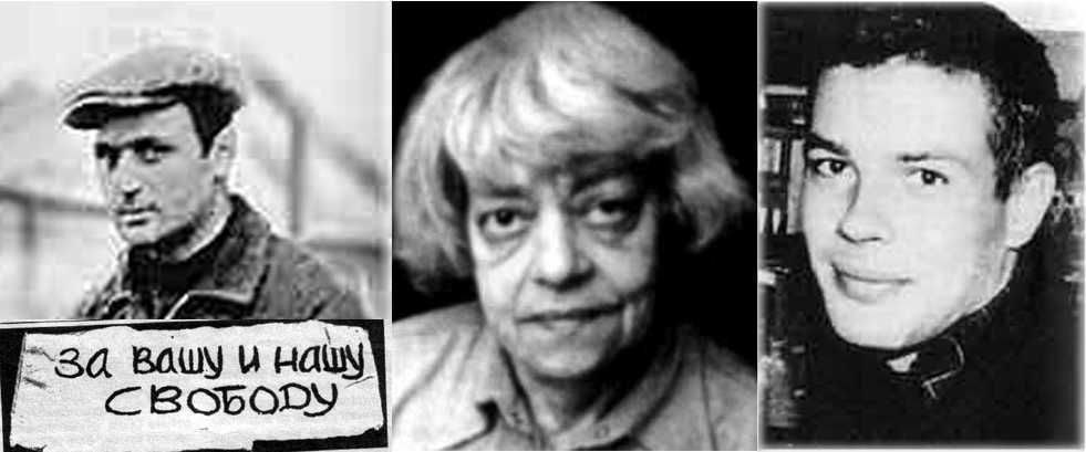 שלושה מתוך שבעת המפגינים בכיכר האדומה ב-1967 והשלט "בעד חירותכם וחירותנו"