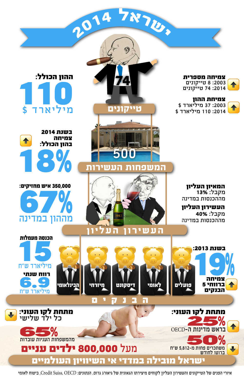 במקביל, בירחון "דה מארקר" שעסק ב-500 האנשים העשירים בישראל, מדווחים לנו שההון שלהם גדל השנה (2014) ב-18 אחוזים. על הדרך, אנחנו מקבלים גם טבלה שמראה לנו את קצב גידול הטייקונים במדינה. את מספרם ב-2003 (עת נתניהו פסע לתוך משרד האוצר) – 8, לעומת מספרם בשנת 2014, אחרי שלוש קדנציות של שלטונו – 74.