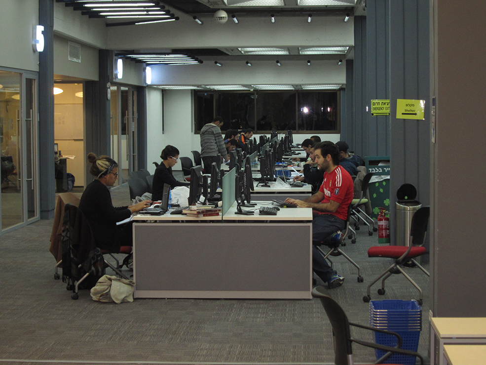 בינואר 2012 סיימה אוניברסיטת תל אביב לשפץ את ספריית מדעי החברה. כמה שבועות לאחר פתיחתה המחודשת, פנתה אגודת הסטודנטים להנהלה וביקשה ממנה לפתוח את הספרייה במשך כל הלילה בתקופת הבחינות. ההנהלה נענתה לבקשה והחלה לבצע פיילוט. "הפתיחה בלילות עולה מאות אלפי שקלים בשנה", מסבירה שלומית פרי, מנהלת הספרייה, כשאני יושב במשרדה יום למחרת. "התבקשנו למדוד הרבה הבטים בפעילות הספרייה: נוכחות, באילו שעות מגיעים סטודנטים וכמה מגיעים. רצו לראות שיש להוצאה הכספית הצדקה".