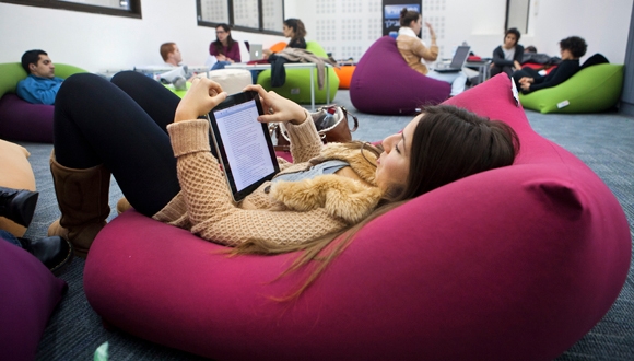 בשעה 2:00 נמצאים בספרייה כ-40 סטודנטים. מדפי הספרים הארוכים, מוצגים מהתקופה הפרה-היסטורית, עומדים מיותמים ואף אחד לא ניגש אליהם. כולם צמודים למחשבים הניידים ולאייפדים. במועדון של הספרייה ריח הקפה השחור הולך ומתחזק. כוסות הנייר הריקות זרוקות על השולחנות ועל השיש, הפח מלא עד גדותיו.