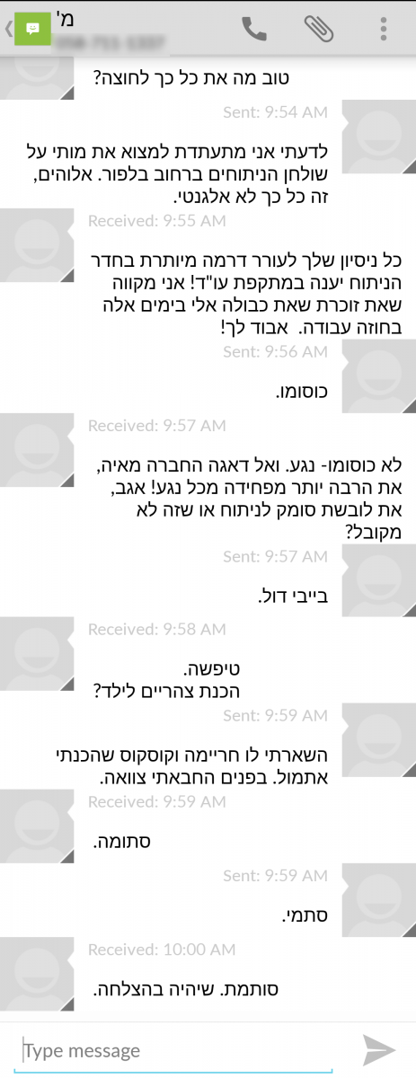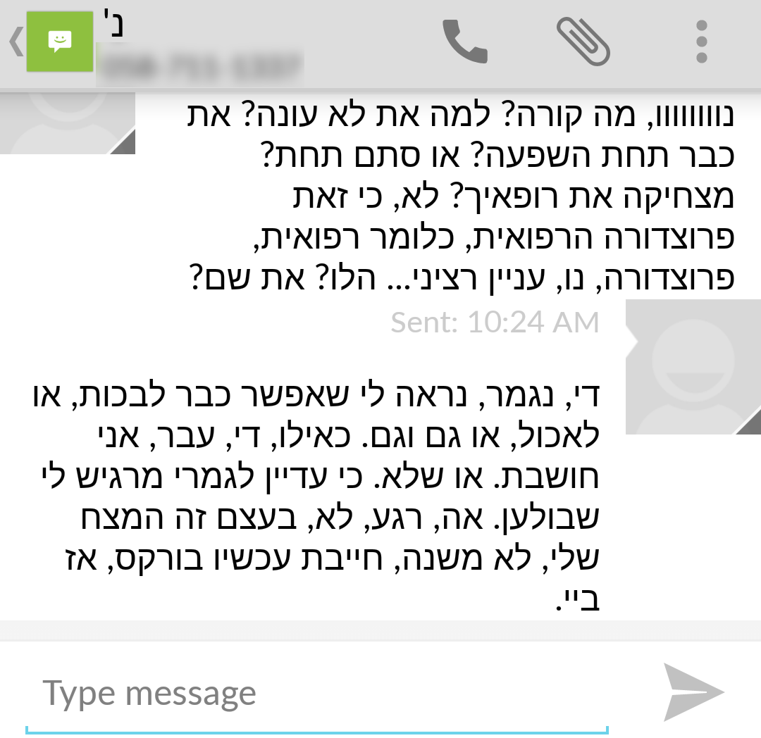 עכשיו סוף סוף הוא מתמקד לי בפרצוף ולא רק בחתך ופולט "אהההה, עכשיו אני זוכר אותך, היתומה הטריה! דווקא השארת עלי רושם טוב בפגישה המקדימה. יאללה, סיימנו, את נקייה ותפורה ונגמר, ללוות אותך לסוויטה שלך היכן שהשארת את הבגדים?" "כן, ד"ר, בבקשה, בטוחה אגב שלא סיפרת לאף אחת לפני את הבדיחה הזאת על הסוויטה, ואם הייתם מגישים לי כאן וודקה במקום אלחוש במזרק גם הייתי צוחקת עכשיו נורא. תודה. עכשיו רק אם לא אכפת לך ללכת לפניי ולא מאחורי, כי החלוק והכל… כן, יופי, הנה, תודה, תודה רבהשנגמר"