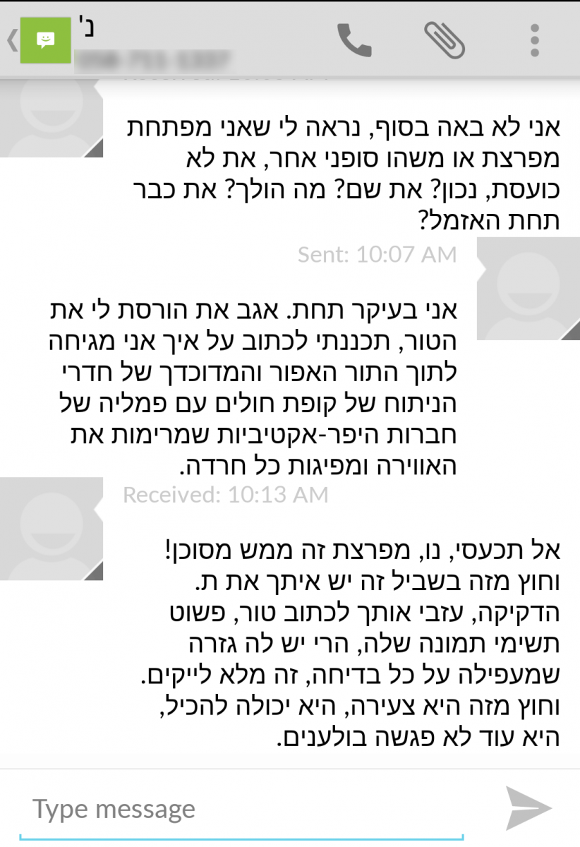 בינתיים הוא תופר אותי אגב, כמו תיק עור קרוע שנשלח למתפרה, עוד כניסה ועוד משיכה, ועוד אחת ו"את לא מרגישה, נכון?" מרגישה, באמא שלך, מרגישה, אבל זה כלום לעומת התקף החרדה. איפה החמצן שלי, איפה התקרה ואיפה הרצפה? ומאיפה צצו כל הבולענים האלה פתאום שמחכים לי בכל פינה? וממתי אני הטיפוס הזה שכשלא עונים לה מיד נכנסת לחרדה בלתי נשלטת ואיומה כי משהו נורא בטוח קרה? אבל זה בלב כי לרופא אני דופקת חפירה עם איכויות שלא היו מביישות גם מנהרת חמאס, לפטפט אני הרי יכולה בכל מצב, גם כשדוקרים, חותכים, כורתים וסופגים ממני את הדם.
