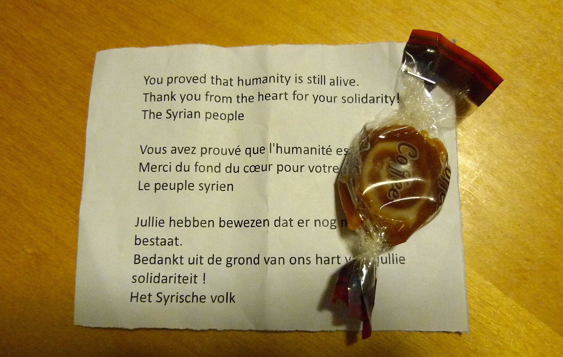 מחוות-תודה שחילקו הפליטים הסורים למתנדבים בפארק מקסמיליאן. בפתק נכתב באנגלית, צרפתית ופלמית״הוכחתם שהאנושיות עדיין חיה, תודה לכם מקרב לב על הסולידריות! העם הסורי״, בריסל, ספטמבר 2015