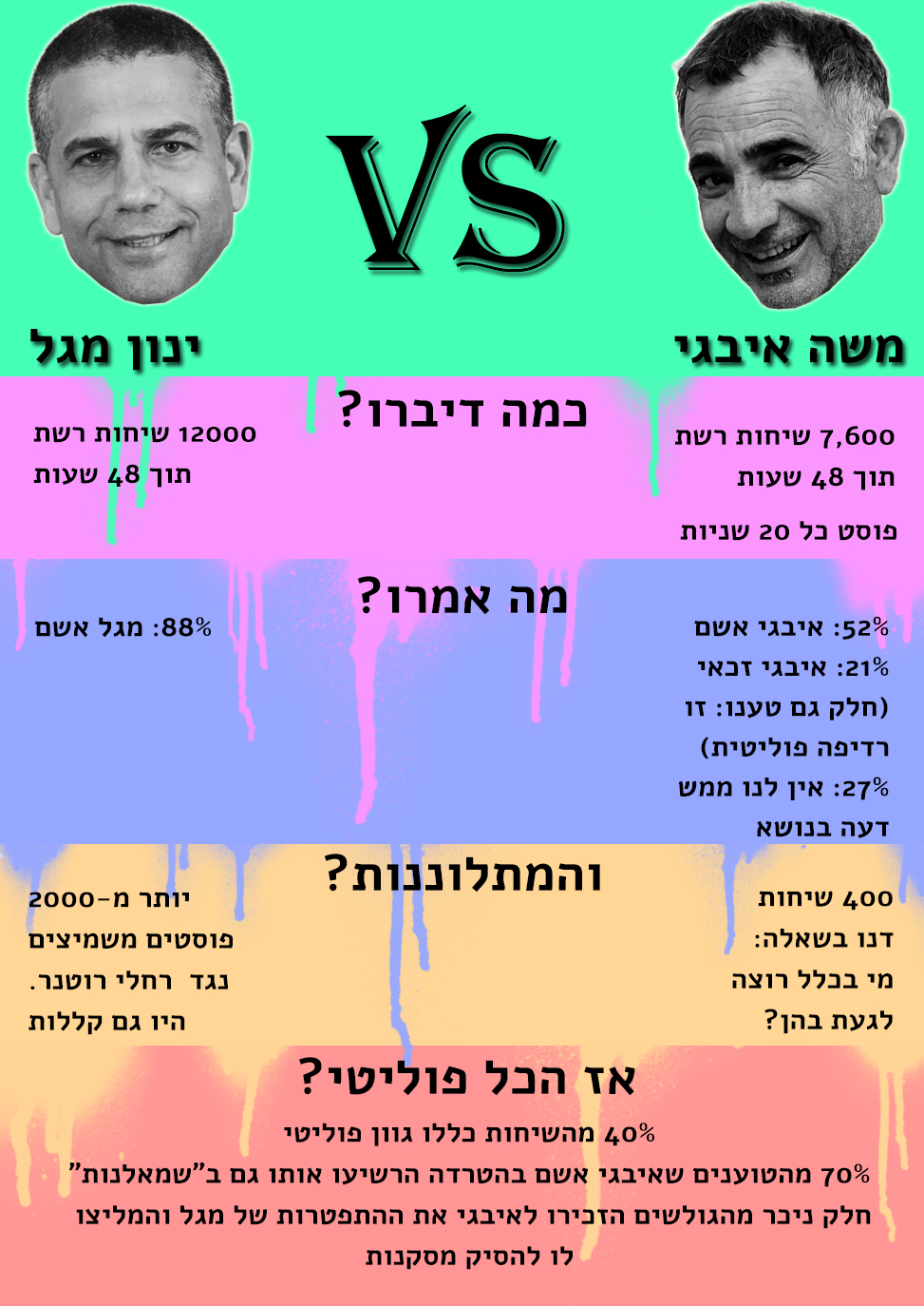 - ויש גם טיפ לגולשים: אל תמהרו להתייצב לצד חבר. 600 פוסטים נגד אריה מוסקונה ואלברט אילוז, 80% מהם ביקורתיים.