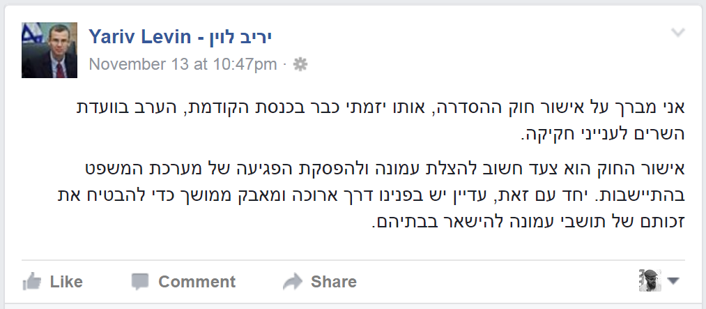 יריב לוין מברך על אישור החוק. הוא לא מברך על ניצחון, כי הוא בכלל לא מתכוון לנצח בקרב על עמונה. לוין מתכוון ומתכנן להפסיד. אמנם הפסד טכני בבית המשפט, אבל עדיין הפסד. תשאלו, ״אבל לוין הרי מתבסס על מתפקדי ליכוד התומכים בהתיישבות – אז למה לו לעזאזל לחוקק חוק שגם אם יעבור בכנסת ברור שייפסל בבג״ץ?״. נו-נו, התשובה כבר נמצאת בגוף השאלה.